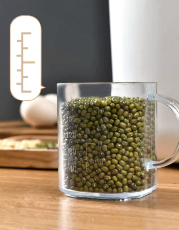 دارای یک عدد پیمانه لیوانی دسته دار ۲۰۰ میلی لیتری اکرولیک